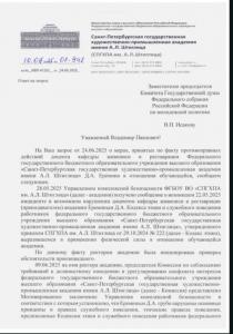 В адрес коммунистов обратились студенты Академии имени Штиглица. Они рассказали, что доцент кафедры живописи и реставрации г-н Еремин применил физическое насилие к одной из студенток магистратуры. Инцидент произошел во время подготовительных занятий с абитуриентами. При этом он попал на видео.