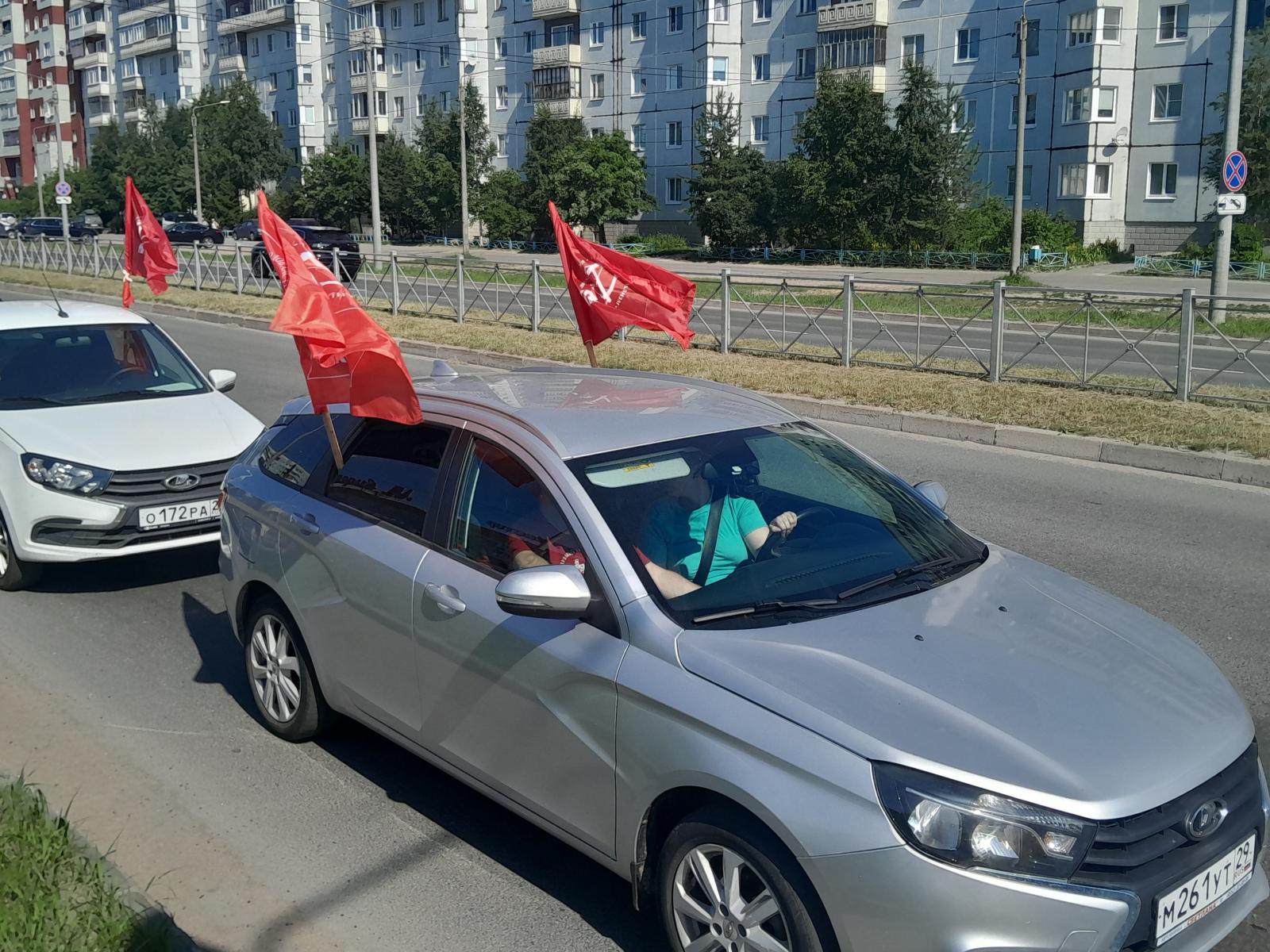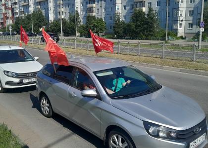 Жители Северодвинска с интересом встречали кортеж машин под красными знаменами: делали памятные фотографии, а водители сигналили участникам автопробега.