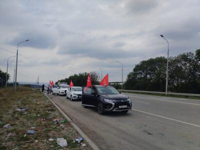 Сформировав краснознаменную автоколонну, участники автопробега отправились на Ставрополье, и, преодолев под одобрительные сигналы встречных автомашин сотню километров, через полтора десятка поселков, сел и станиц, прибыли в город Минеральные Воды для участия в митинге финального этапа автопробега КПРФ "Красные Крылья Победы".