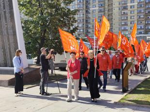 Далее колонна направилась в Сквер Пограничников. Под красными знамёнами и звуки советских песен коммунисты возложили цветы к мемориалам в честь пограничников, погибших во время войны, и к памятнику Ф.Э. Дзержинскому.