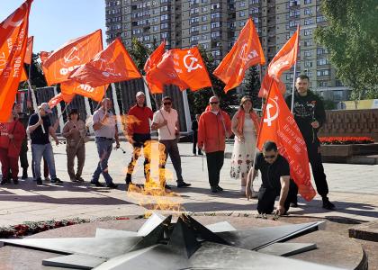 Акция началась от здания Тюменского обкома КПРФ. Первой точкой маршрута стала Площадь Памяти. Участники акции возложили алые гвоздики к Вечному огню, отдавая дань уважения павшим.