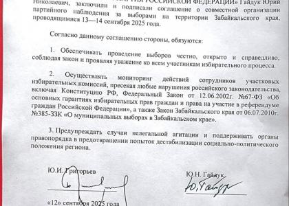 Лидеры региональных отделений КПРФ и партии «Справедливая Россия — За правду» заключили соглашение о совместном наблюдении за ходом голосования на выборах в Забайкальском крае, которые состоятся 13-14 сентября 2025 года.