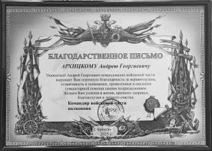 Благодарственное письмо от командования одной из войсковых частей получил первый секретарь Брянского обкома КПРФ А.Г. Архицкий. В письме военные выражают огромную благодарность за неравнодушие, отзывчивость и понимание, проявленные в оказании гуманитарной помощи подразделениям Российской армии.
