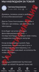 10 сентября 2025 года в сети Интернет с фишинговой (ненастоящей) почты Курского регионального Комитета КПРФ, подписанное якобы секретарем КРО ПП КПРФ Канунниковой Светланой Игоревной, в органы исполнительной власти и избирательные комиссии были разосланы письма с угрозами физического насилия в адрес сотрудников вышеизложенных организаций.
