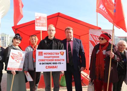 Плакаты, с которыми вышли участники пикета, стали красноречивым напоминанием о сути и последствиях той трагедии: «Октябрь 1993 года – преступление без срока давности», «Обещали победу демократии – получили нищету народа и деспотизм олигархии», «1993 – целились в коммунизм – стреляли в Россию», «"Пятая колонна" – творец режима бандитского капитализма в России».