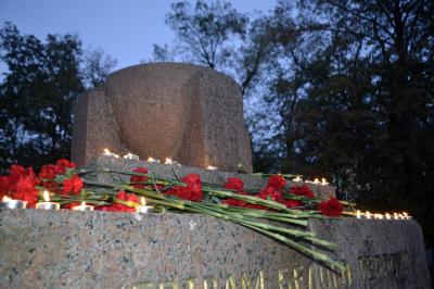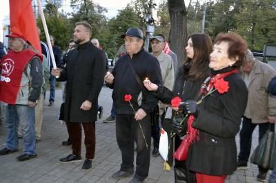 К памятнику жертвам Белого террора – защитникам Советской власти, казнённым в октябре 1919 года белобандитами – предшественниками ельцинской клики, были возложены красные гвоздики и зажжены поминальные свечи.