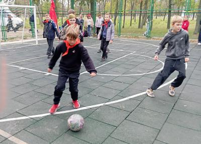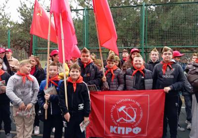 Завершив торжественное мероприятие, два пионерских отряда провели товарищеский матч по футболу, в котором приняли также участие взрослые члены КПРФ, в качестве вратарей двух команд.