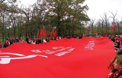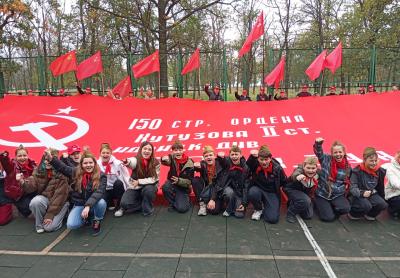 После торжественного построения, посвященного Дню укреплению рядов комсомольско-пионерского актива Запорожского обкома КПРФ, все участники сбора, торжественно, под «Марш десантников», развернули масштабную копию Знамени Победы, ставшую главным символом Союзного антифашистского марша-эстафеты «Наша Великая Родина».