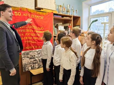 Ученикам рассказали историю комсомола, его главные достижения и основные этапы развития. Татьяна Юрьевна поделилась воспоминаниями работы ВЛКСМ в городе и школе, показала уникальные экспонаты. Александр Сергеевич добавил, что Ленинский комсомол существует и сейчас, перечислив все направления работы современного ЛКСМ. Дети слушали очень внимательно, задавали вопросы, с интересом рассматривали представленную экспозицию (особенно их заинтересовали комсомольские билеты и значки ВЛКСМ и ЛКСМ РФ).