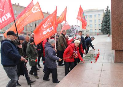 А уже ближе к полудню площадь Ленина стала заполняться красными знамёнами. Коммунисты и комсомольцы, а также беспартийные горожане пришли возложить цветы к памятнику Ленину. Алые гвоздики ещё утром стали появляться у подножия монумента вождю мирового пролетариата – жители города партизанской славы, несмотря на рабочий день, не забыли о празднике.