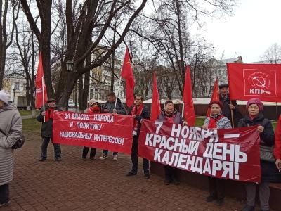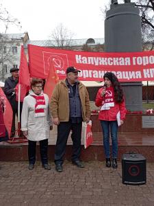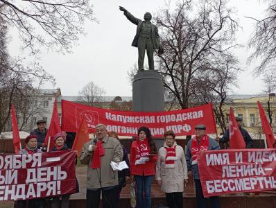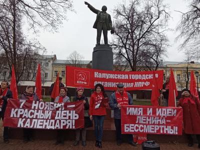 Калужане скандировали лозунги: «Слава Великому Октябрю!», «Человеку труда — достойную жизнь!», «Дню Великого Октября — статус государственного праздника!», «Наша Родина — Советский Союз!», «Наше дело правое — победа будет за нами!». На митинге распространялись газеты «Правда» и «Калужская правда».