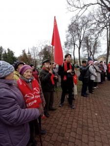 По традиции в начале митинга партийный билет члена КПРФ был вручен киномеханику кинотеатра «Пионер» Андрею Николаевичу Горину. Он поблагодарил калужских коммунистов и Марину Васильевну за реализацию его идеи об организации просмотра советских патриотических фильмов в областном центре. 30 октября в актовом зале Калужского горкома КПРФ начал свою работу кинотеатр «Ударник», где состоялись показы фильмов о героях-комсомольцах Людиновского подполья времён Великой Отечественной войны — «Людиновские орлята» и «72 часа». Очередной сеанс в «Ударнике» состоится 14 ноября: будет демонстрироваться фильм «Ленин в Октябре».