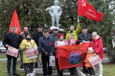 Красные знамена однопартийцев КПРФ вздымались вверх по дороге к памятнику В.И. Ленину, где состоялось торжественное возложение цветов и митинг по случаю памятной даты.