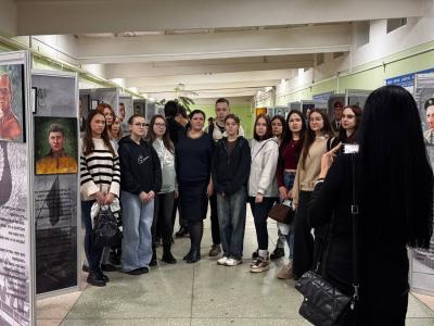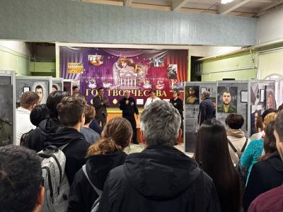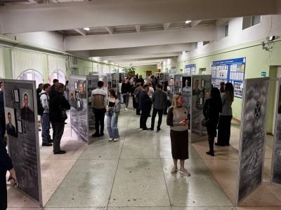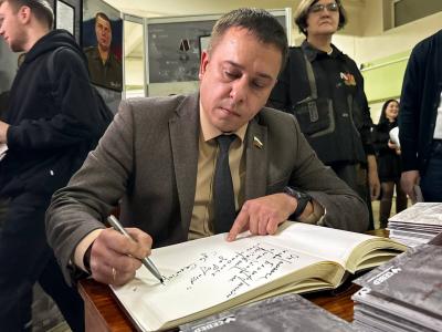 Айрат Гибатдинов вместе с участником СВО, депутатом Ульяновской городской Думы Антоном Шиловым, депутатом ЗСО Романом Султашовым и секретарем областного Комитета КПРФ Рамилем Хакимовым поприветствовали студентов, преподавателей, родственников Героев и организаторов выставки.