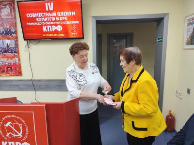 Торжественным моментом в начале работы стало вручение партийных наград. Лидер областных коммунистов Тамара Казанцева вручила орден ЦК КПРФ «За заслуги перед партией» члену областного Комитета, первому секретарю Тюменского райкома Сергею Диденко и члену КРК Зинаиде Коногоровой.