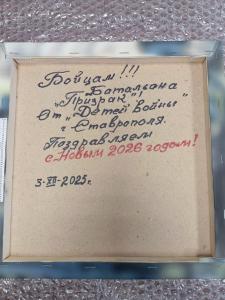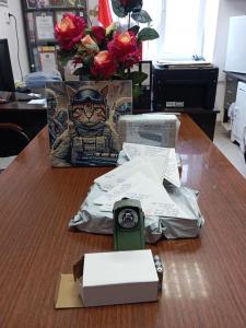 Были переданы письма бойцам от детей войны и подарок командованию батальона - выполненная алмазной мозаикой картина «Котик-боец», сделанная членом совета Н.Н. Беляевой.