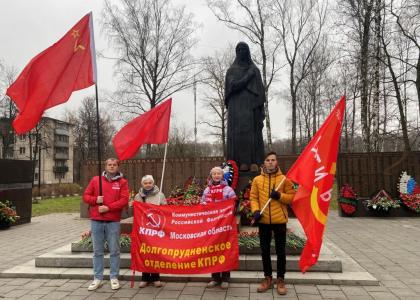 Коммунисты Долгопрудного возложили цветы к памятной доске на Площади Собина, установленной в честь коммунистов 2-ой Московской стрелковой дивизии, которые в этом здании 28 ноября 1941 года дали клятву "Стоять насмерть. Москву врагу не сдавать!".