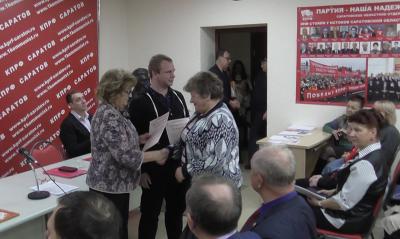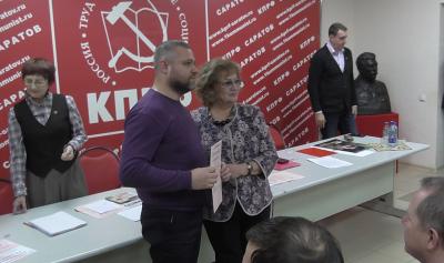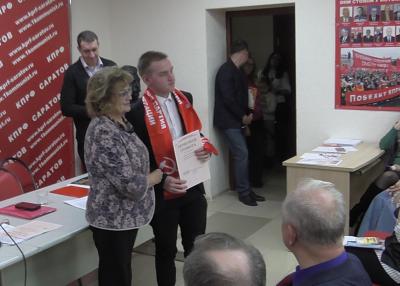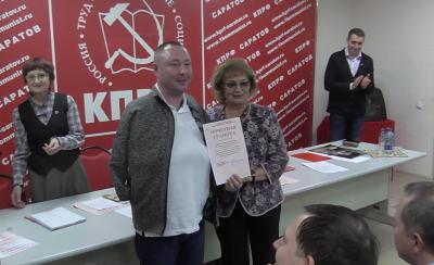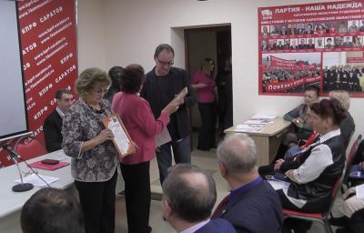 Первый секретарь Саратовского обкома КПРФ, депутат Госдумы О.Н. Алимова вручила победителям соцсоревнования Почетные грамоты обкома по различным категориям за достигнутые успехи в организационно-политическом укреплении парторганизации, в активизации и повышении эффективности партийно-политической работы среди населения, в т.ч. в организации мероприятий, оказывающих всемерную поддержку протестных народных действий, систематической работе по сбору и отправке гуманитарной помощи в зону проведения специальной военной операции, проведению голосования в рамках Народного референдума КПРФ.