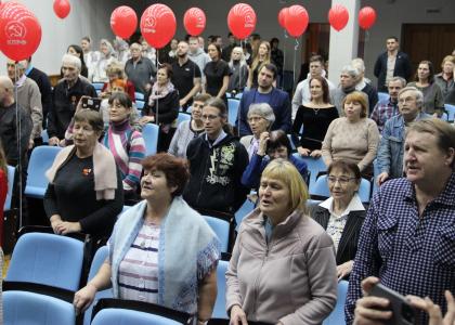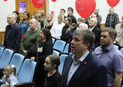 В зале библиотеки собрались не только члены КПРФ, их близкие, сторонники партии, но и все желающие из числа горожан, вход на мероприятие был свободным. Начался концерт с вручения партийных билетов новым членам партии, а также с исполнения «Интернационала».