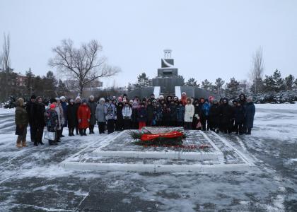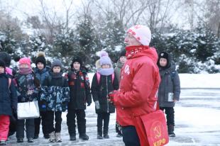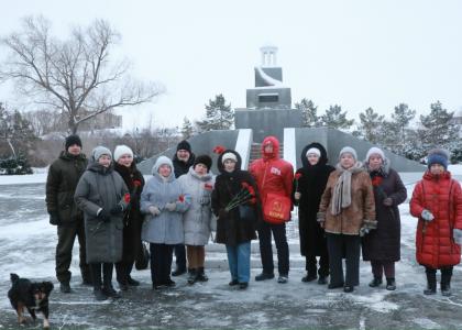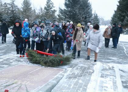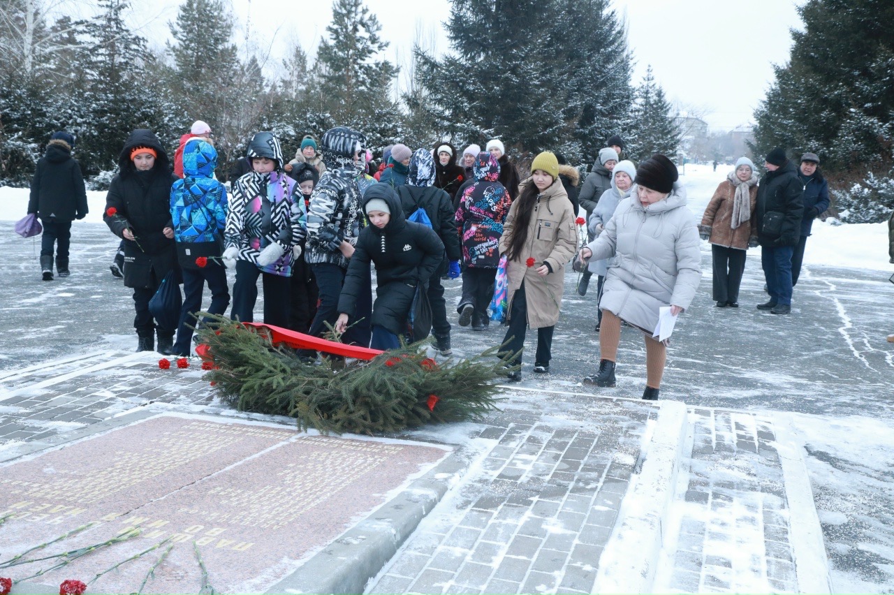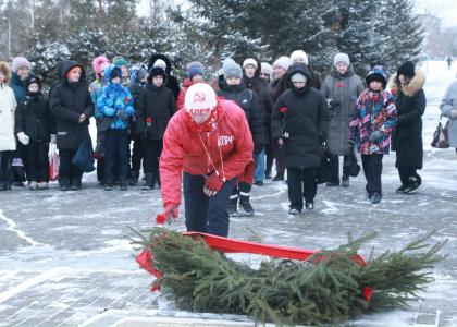 У памятника собралось около пятидесяти человек. Пришло и два класса соседней школы № 97: именно там, когда морозы были особо сильными, собирались ветераны, живущие в микрорайоне, и школьники.