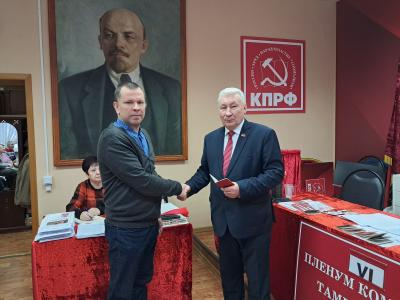 Перед проведением пленума обкома первый секретарь А.И. Жидков вручил 13 партийных билетов вступившим в КПРФ в Октябрьском, Советском, Рассказовском, Тамбовском районных и Моршанском городском отделениях партии.