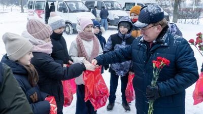 Ребят, которые стояли рядом, отряд тимуровцев, Н.Н. Иванов поздравил и с открытием памятника, и с наступающим Новым годом.