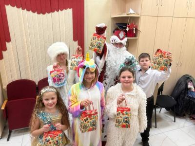 В Ленинском и Гагаринском районах в преддверии Нового 2026 года детям из многодетных семей, детям участников СВО коммунисты вместе с Дедом Морозом и Снегурочкой вручили сладкие подарки.