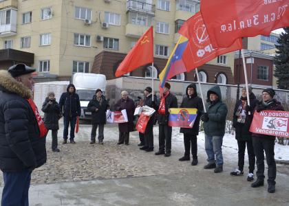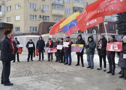 В столице Черноземья на площади Никитина воронежские коммунисты провели пикет в поддержку Боливарианской Республики Венесуэла, подвергшейся бандитскому нападению со стороны США, и её законного президента Николаса Мадуро, похищенного и вывезенного американским спецназом.