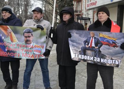 Алые знамёна, флаг братской Венесуэлы, яркие плакаты "No pasaran! Vensеremos!" ("Они не пройдут! Мы победим!"); "Руки прочь от Венесуэлы!" с перечёркнутым профилем Трампа; "Империализм - зло человечества"; "Нет крови за нефть!"; "Свободу президенту Венесуэлы Николасу Мадуро!" были развёрнуты в десятках тысяч километров от столицы Венесуэлы Каракаса.