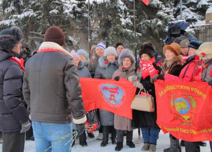 У челябинского мавзолея Владимиру Ильичу с бронзовым бюстом, несмотря на морозную погоду и рабочий день, собралось более 40 коммунистов и членов Союза Красных сил области.