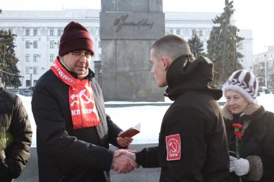 В завершении мероприятия Игорь Гуменюк вручил партийный билет комсомольцу, студенту Роману Святохе, которому в этот день исполнилось 18 лет. Ровно 2 года назад, также на площади, возле памятника В.И. Ленина ему был вручён членский билет ЛКСМ РФ.
