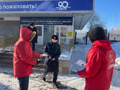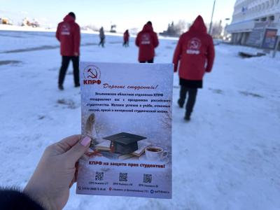 В ходе визитов в ведущие вузы региона — Ульяновский государственный технический университет (УлГТУ), Ульяновский государственный университет (УлГУ), Ульяновский государственный педагогический университет (УлГПУ) и Ульяновский институт гражданской авиации (УиГА), а также Ульяновский электромеханический колледж (УЭМК) - студентам были вручены праздничные листовки с поздравлением и напоминаем о том, что КПРФ всегда стоит на защите прав студентов!