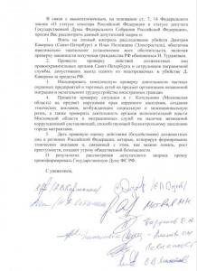 В документе констатируется, что систематические преступления против граждан России, приобретающие форму коллективных расправ, переходят в разряд угроз национальной безопасности, а бездействие ответственных лиц на местах способствует формированию этнических анклавов. Депутаты перечислили конкретные примеры преступлений мигрантов. Они поставили вопрос об оценке действия силовиков во время резонансных конфликтов, о проведении тотальной проверки нанимающего охранников-мигрантов бизнеса, о ликвидации мигрантских анклавов.
