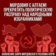 Бюро Мордовского рескома КПРФ заявляет о своей полной и безоговорочной солидарности с алтайскими товарищами, их семьями и всем краевым отделением партии. Мы требуем: