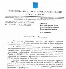 В связи с этим направила запрос в администрацию города Саратова с просьбой изучить проблему и оказать содействие в её решении. На днях получила ответ, в котором указано, что вопрос организации маршрута будет рассмотрен на комиссии по вопросам работы и развития общественного транспорта на территории муниципального образования «Город Саратов».