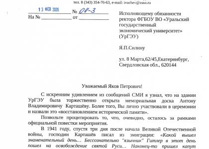 13 февраля 2026 года заместитель Председателя Законодательного Собрания Свердловской области, руководитель фракции КПРФ Александр Ивачёв направил официальное обращение исполняющему обязанности ректора УрГЭУ Якову Силину с требованием демонтировать мемориальную доску Антону Карташёву, недавно установленную на здании университета.