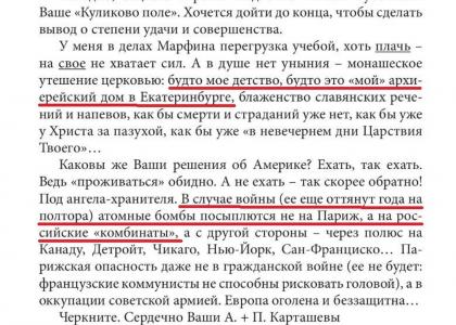 Справка: В 1941 году, спустя три дня после нападения нацистской Германии на СССР, Антон Карташёв в письме из эмиграции восторженно приветствовал вторжение Гитлера, назвав его «освобождением святой Руси» и «капутом Совдепии». В 1948 году, когда Советский Союз восстанавливал разрушенную войной экономику, а Урал поднимал заводы, Карташёв выражал надежду, что американские атомные бомбы будут сброшены именно на российские промышленные центры — Свердловск, Нижний Тагил, Челябинск.