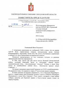 В своем обращении парламентарий призвал ректора УрГЭУ проявить государственный подход и принять решение о демонтаже мемориальной доски как установленной ошибочно, без учёта всей полноты исторических фактов.