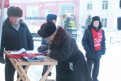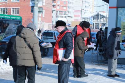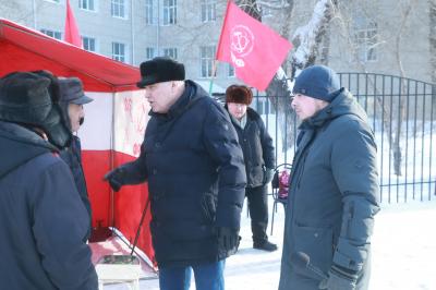 В Омске на этой неделе серия пикетов в поддержку Народного референдума КПРФ продолжилась акциями в Кировском округе около Кировского и «Социального» рынка (первый секретарь МО КПРФ И.В. Федин), в Центральном округе на остановке «Степная» (первый секретарь Куйбышевского МО КПРФ А.А. Казак) и в Ленинском округе (первый секретарь МО КПРФ В.А. Свистунов). Традиционно в этих мероприятиях принял участие первый секретарь Омского обкома КПРФ А.А. Алехин.