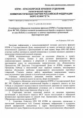 20 февраля 2026 года Бюро Красноярского краевого отделения КПРФ приняло постановление, касающееся консолидированной позиции партии по защите своих активистов от политического давления. Документ был принят в развитие инициативы депутатов фракции КПРФ в Государственной Думе, которые выступили с обращением «Требуем честной политической борьбы и широкого диалога во имя Победы и созидания!».