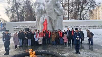 К Вечному огню возложили гирлянду Воинской Славы и цветы. Память отдавших жизни за Отечество почтили минутой молчания.