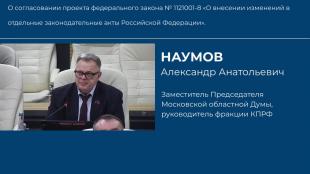 Руководитель фракции КПРФ Александр Наумов выступил на 130-м заседании Мособлдумы по вопросу согласования проекта федерального закона «О внесении изменений в отдельные законодательные акты Российской Федерации» (по вопросу установления правовых гарантий осуществления встреч депутатов представительных органов субъектов Российской Федерации и органов местного самоуправления с гражданами и избирателями, а также зарегистрированных кандидатов в депутаты)», внесенного депутатами фракции КПРФ в Государственной Думе ФС РФ.