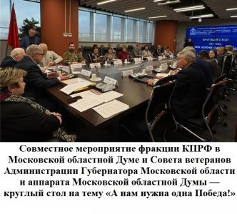 15 октября 2025 в Мособлдуме прошло совместное мероприятие фракции КПРФ в Московской областной Думе и Совета ветеранов Администрации Губернатора Московской области и аппарата Московской областной Думы — круглый стол на тему «А нам нужна одна Победа!»