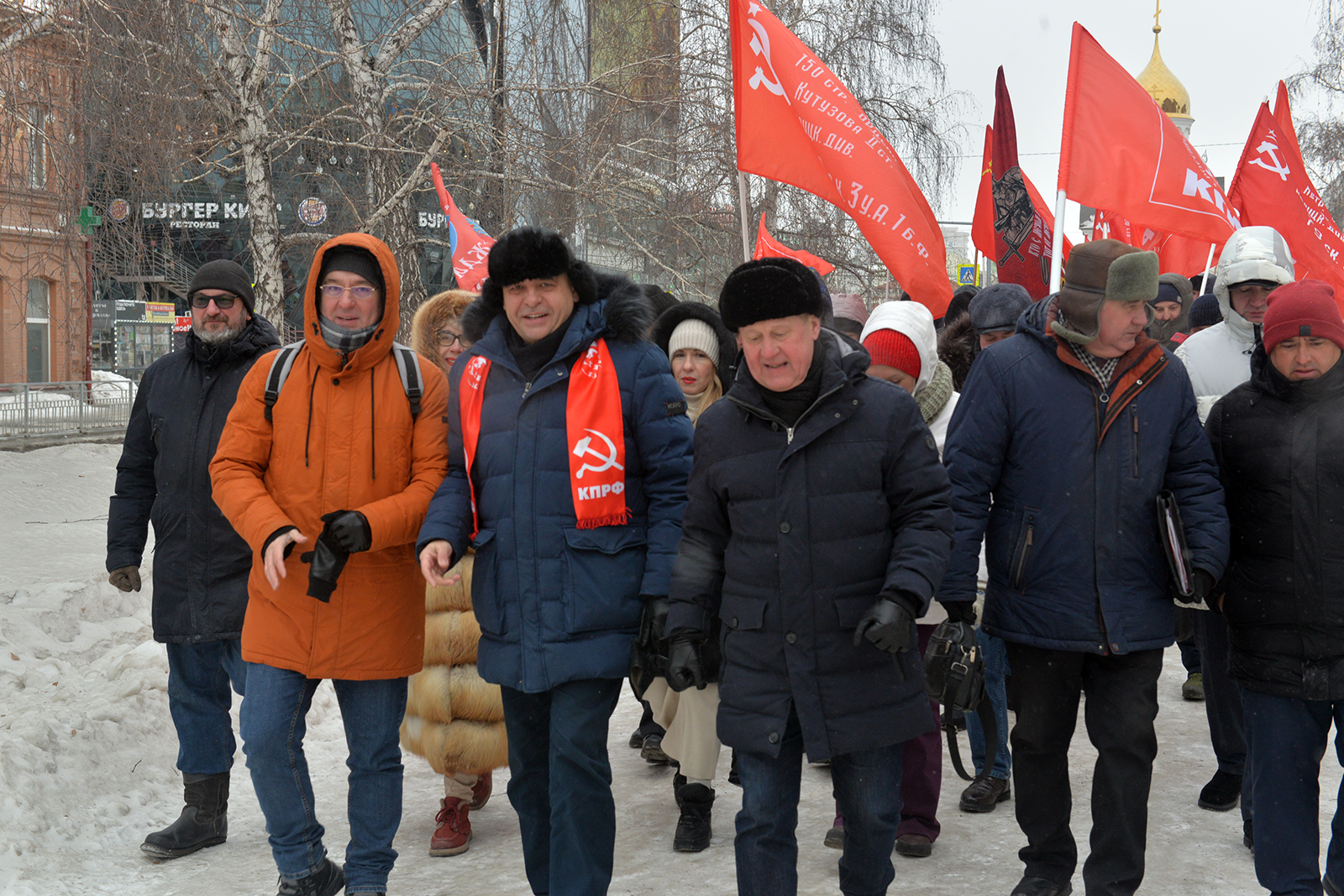 Утром 23 февраля в Новосибирске несмотря на 20-градусный мороз и гололед состоялись традиционные шествие и митинг в честь 108-й годовщины со дня создания Красной армии и Военно-морского флота. Мероприятие стартовало от часовни во имя Святителя Николая и завершиловь у бюста Александру Ивановичу Покрышкину.