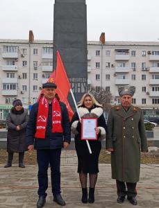 На митинге поздравив собравшихся, также выступила руководитель фракции КПРФ в Ростовской-на-Дону городской Думе, секретарь Ростовского-на-Дону ГК КПРФ, первый секретарь Ворошиловского РК КПРФ, Наталья Оськина: «Поздравляю защитников с Днём Советской Красной Армии и Военно-морского Флота! Именно они вместе с советским народом в своё время прогнали фашизм с нашей земли. И сейчас наши ребята, наши защитники помогают такой же оголтелый коричневый фашизм прогонять с территории Донбасса. Но напомню, что не было бы Красной Армии без Красной революции, которая дала высвобождение созидательного потенциала человека.