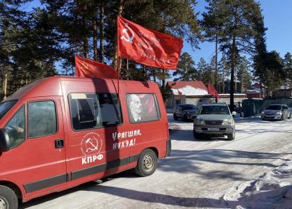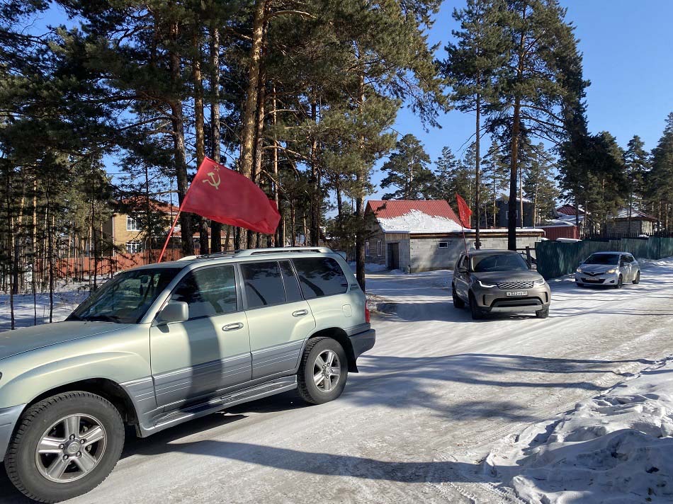 Затем на нескольких автомашинах коммунисты и сторонники КПРФ отправились в п. Радужный, где в прошлом году был установлен памятник Сталину. Получился автопробег с красными флагами Победы, СССР, КПРФ.