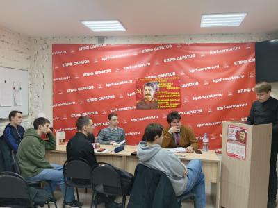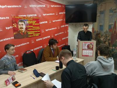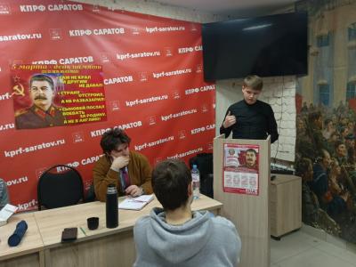 В саратовском горкоме КПРФ молодые коммунисты организовали проведение круглого стола в память об Иосифе Виссарионовиче Сталине, приуроченный к 73-й годовщине со дня кончины одного из ведущих политических деятелей мировой истории, Верховного Главнокомандующего Вооруженными Силами СССР.