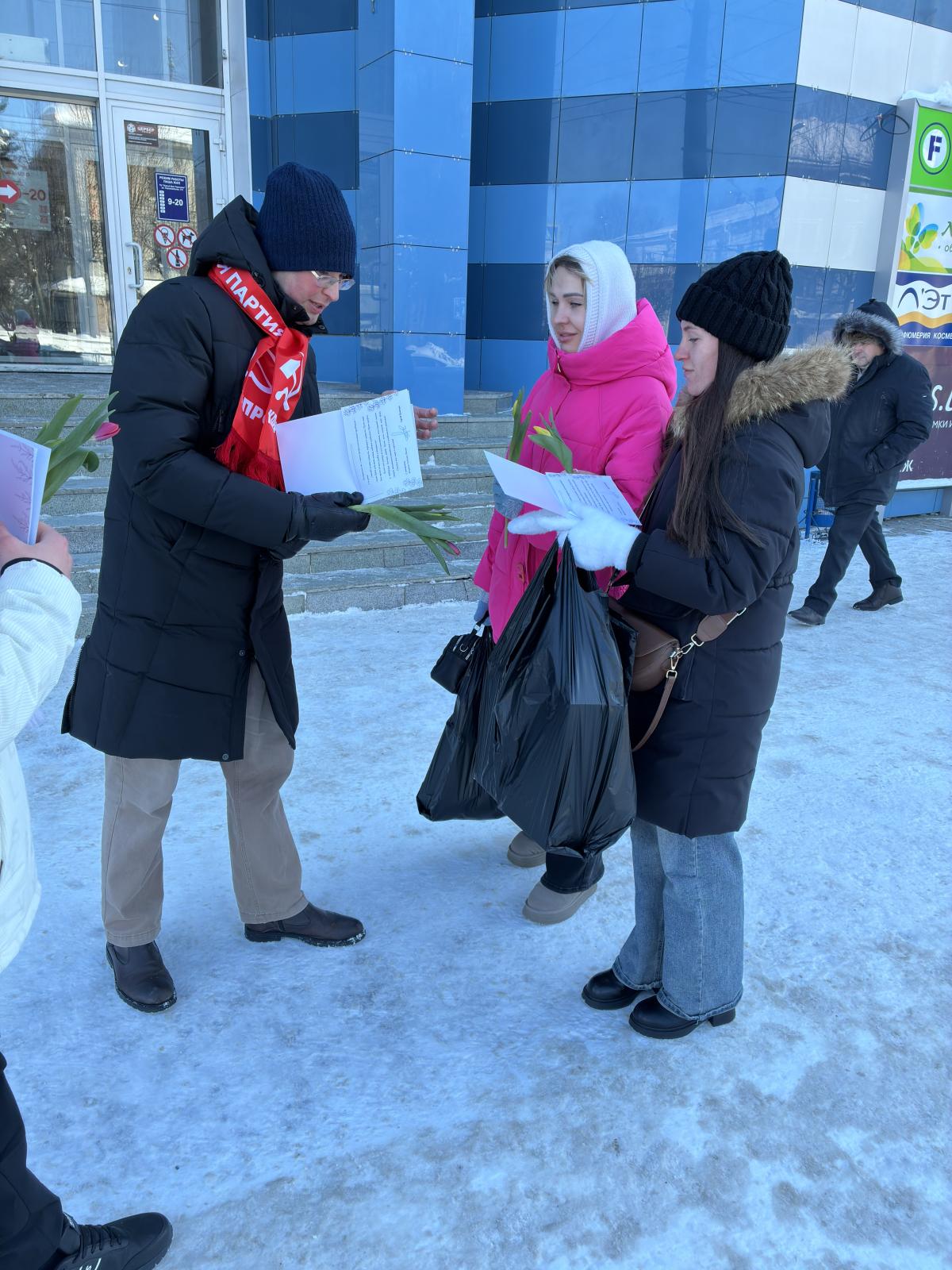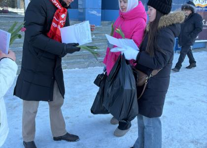 В эти весенние, солнечные, но всё еще морозные деньки партийный актив на улицах дарил проходящим дамам тюльпаны и открытки от депутата Госдумы России Сергея Казанкова. Теплые поздравления в морозное утро прибавили милым женщинам праздничного настроения и радостных улыбок.