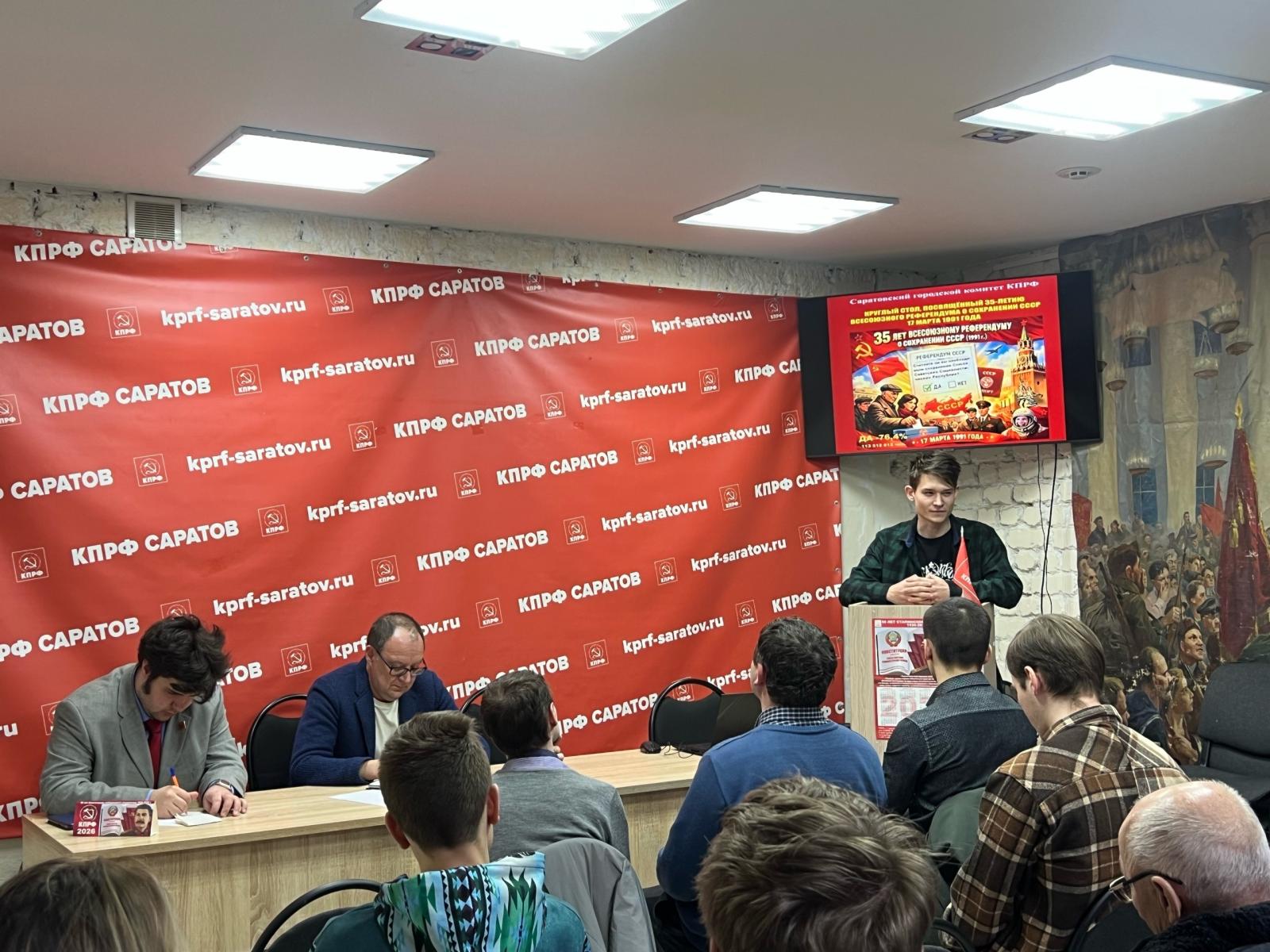 Комсомолец Егор Мартынов выступил с докладом о бюрократическом перерождении партноменклатуры и роли трудящихся в сохранении СССР. Глава комсомольцев города Саратова Алексей Михалкин раскрыл субъективные и объективные факторы, оказавшие влияние на результаты референдума, а также проанализировал влияние политической субъектности в тот период в стране.