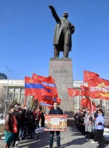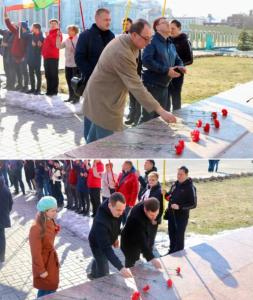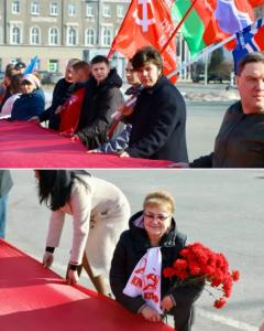 Завершился автопробег на Театральной площади, где было развернуто большое полотно — копия флага Советского Союза. После этого возложили цветы к памятнику Владимиру Ильичу Ленину — основателю первого в мире государства рабочих и крестьян.